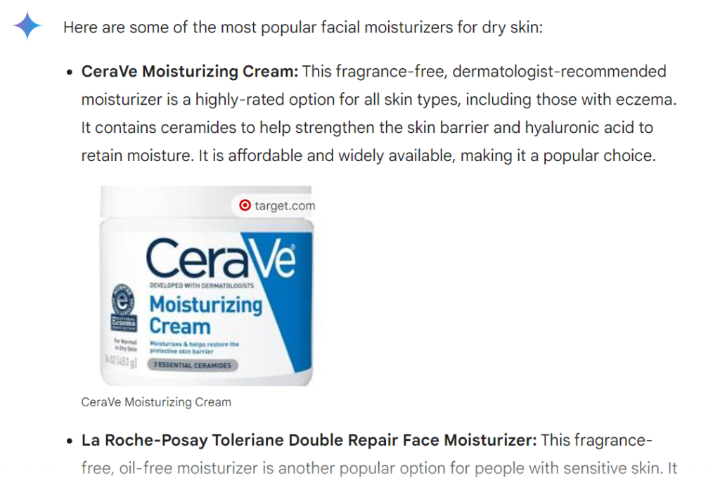 По данным First Page Sage, при поиске товаров Gemini действует аналогичным образом. Например, когда эксперты компании спросили его, какие увлажняющие средства для лица лучше всего подходят для сухой кожи, почти все рекомендации были взяты из второго сайта в результатах поиска — обзорной статьи на People.com.