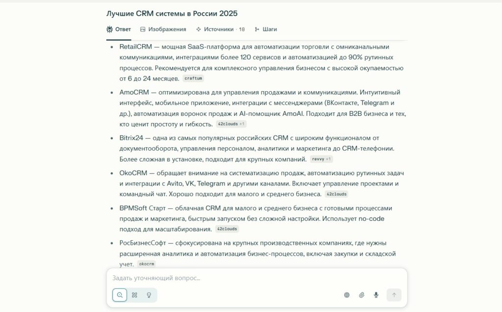 А как на практике. Мы решили протестировать несколько запросов в Perplexity. Вот, что нейросеть выдает по запросу «Лучшие CRM-системы в России в 2025 году» ↓