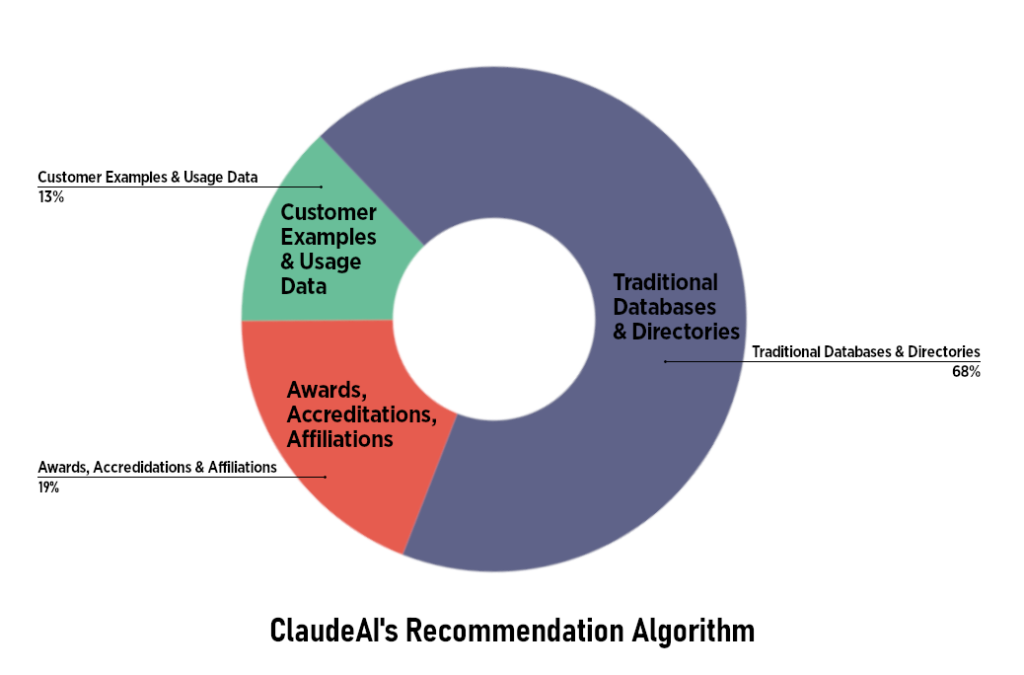 | Claude AI | • Базы данных и каталоги: 68% • Награды, аккредитации и членство: 19% • Примеры использования и данные клиентов: 13% |
