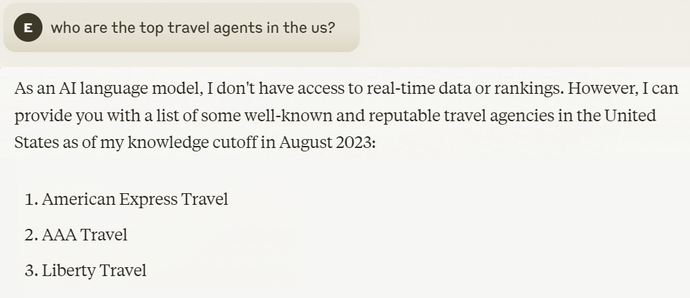 А как на практике. В First Page Sage спросили у Claude кто лучшие турагентства в США. Бот отдал предпочтение компаниям, работающим около 50 лет, а не более молодым, но высокорейтинговым турагентствам.
