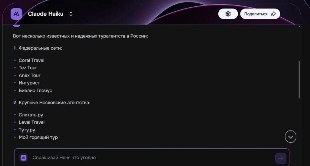 Мы тоже захотели получить список турагентств от Claude AI. Хотя запрос был о лучших компаниях в России, чат-бот порекомендовал несколько федеральных и несколько московских агентств.