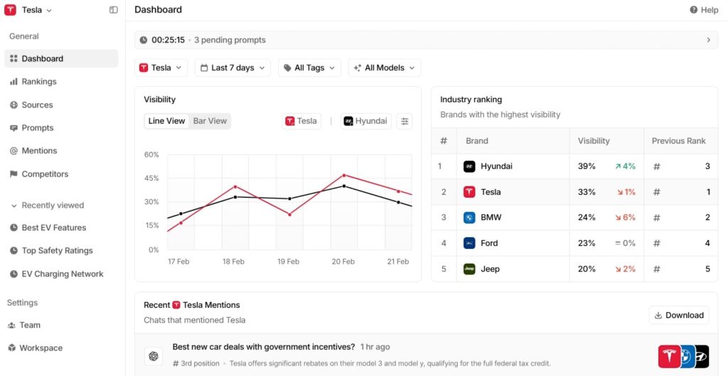 Peec AI — зарубежный сервис AI-аналитики. Здесь анализируют упоминания компаний на AI-платформах. Можно отслеживать не только видимость и частоту цитирования своего продукта, но и те же параметры для продукта конкурентов.