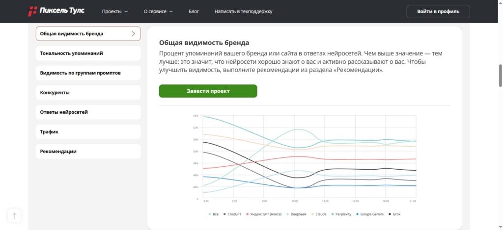 Pixel Tools — российский аналог сервиса Peec AI. Здесь анализируют упоминание компании в нейросетях и то, какую оценку ИИ выдает бренду — положительную или отрицательную. Есть инструменты для контроля трафика из нейросетей и видимости по группам промптов.