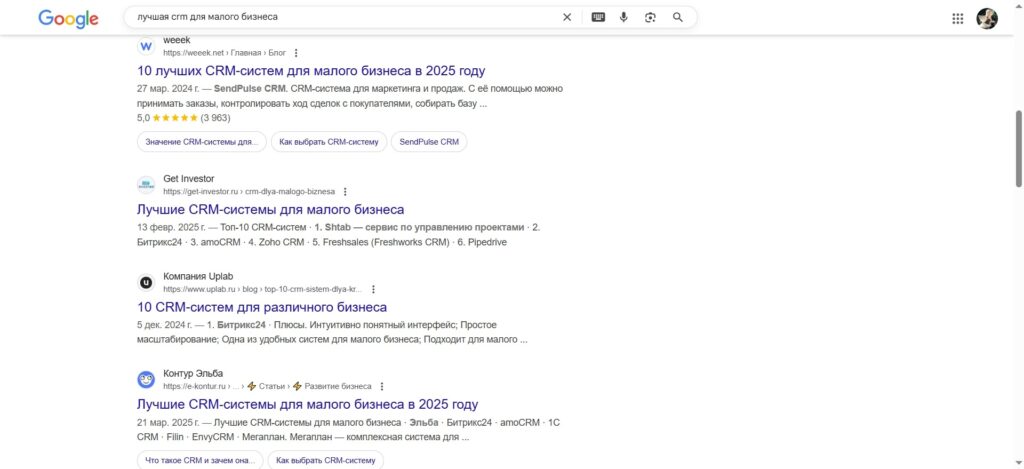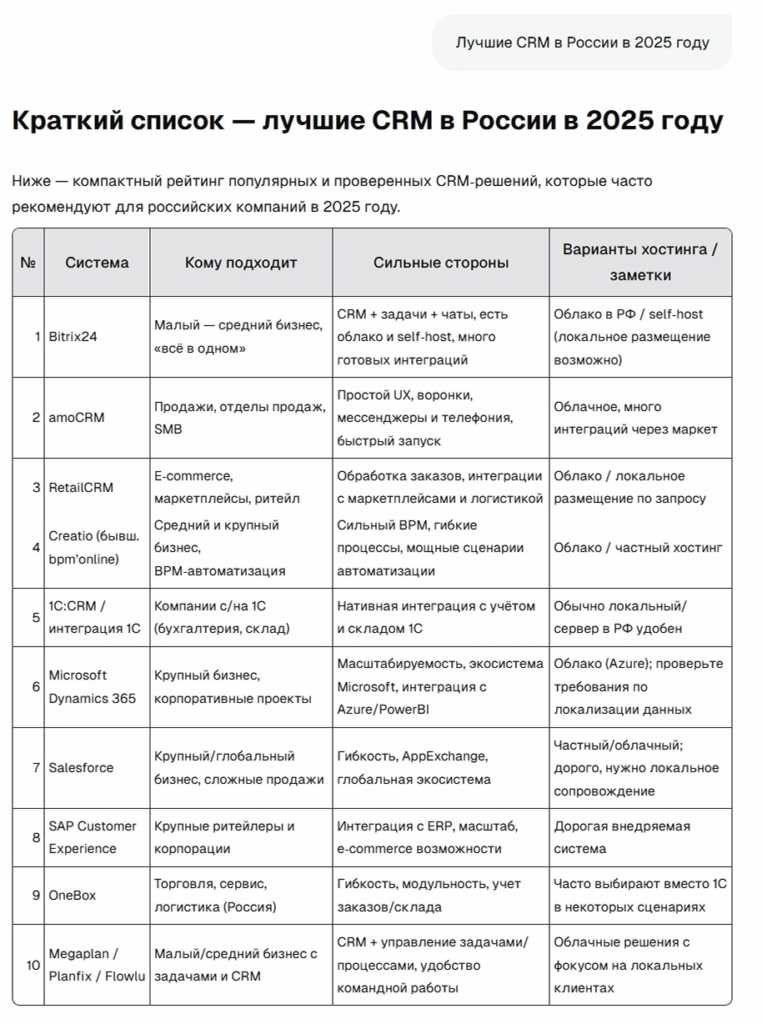 А как на практике. Мы повторили тест First Page Sage. Для этого попросили ChatGPT посоветовать лучшие CRM в России в 2025 году. Судя по списку, который выдал ChatGPT, он черпал информацию из: