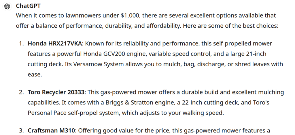 Например, когда в First Page Sage спросили: «Какие газонокосилки дешевле 1000 долларов самые лучшие?», ChatGPT ответил, что выбрал 3 модели, основываясь главным образом на обзорах New York Times и Consumer Reports.