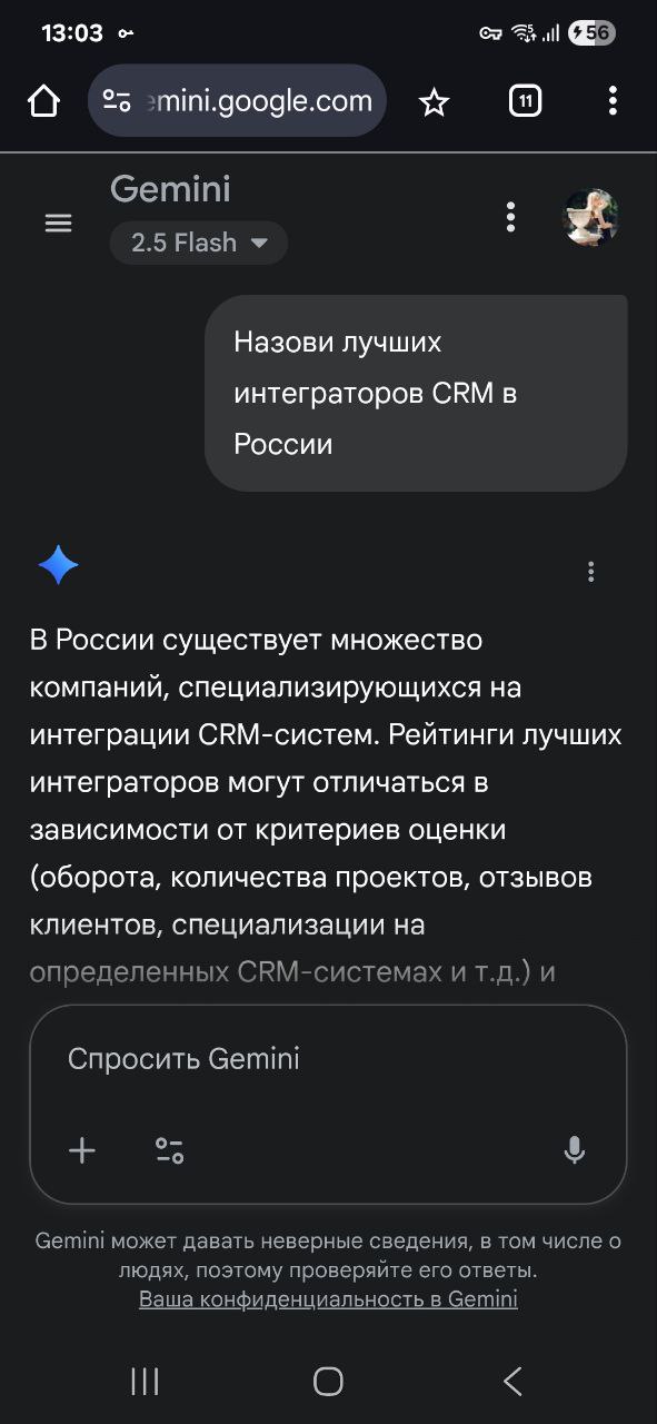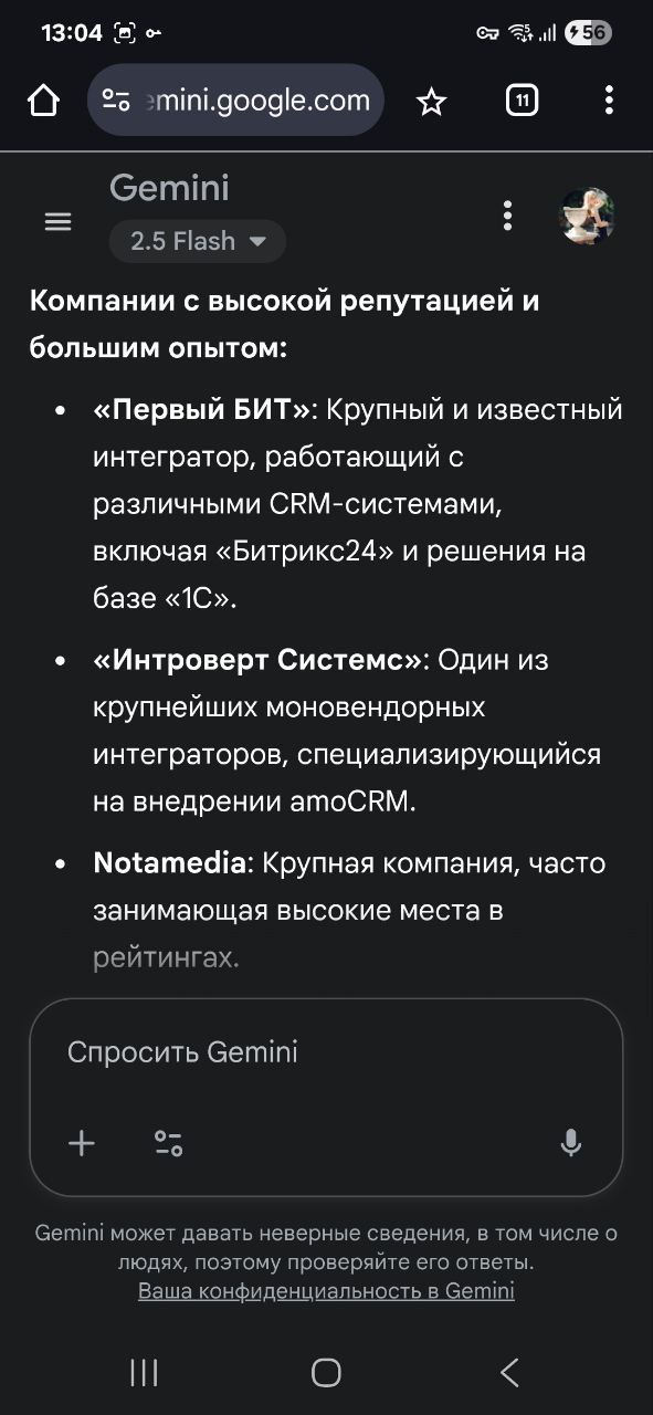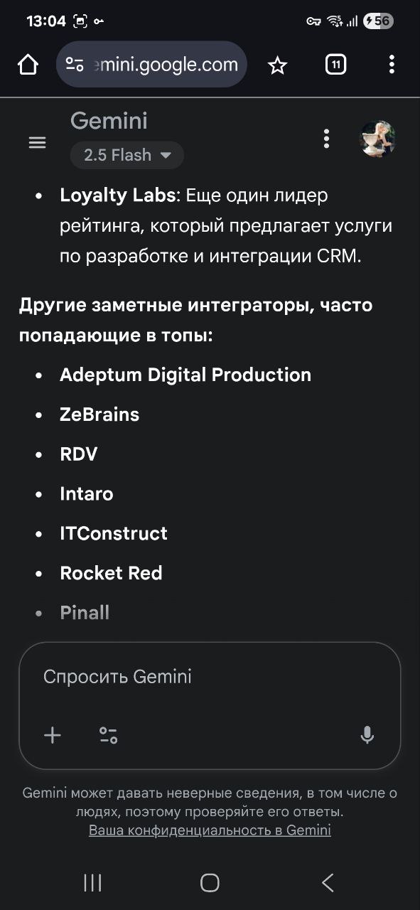 Мы также попробовали поискать информацию в Gemini. Ввели запрос «Лучшие интеграторы CRM в России» и получили такой список ↓
