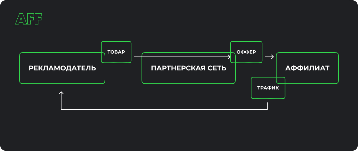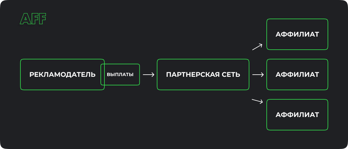 Чтобы понять, что такое партнерская сеть, достаточно представить платформу-посредника между двумя сторонами: рекламодателями, которые хотят продвигать продукты, и арбитражниками (аффилейтами), которые приводят трафик.