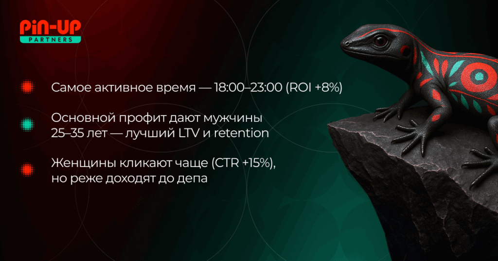 Второе — демография. Основные объемы трафика и стабильный retention давали мужчины 25–35 лет. Эта та самая ЦА, которая чаще взаимодействовала с продуктом и вносила депозиты без длительного прогрева. Они также показали лучший LTV в сравнении с другими возрастными сегментами.