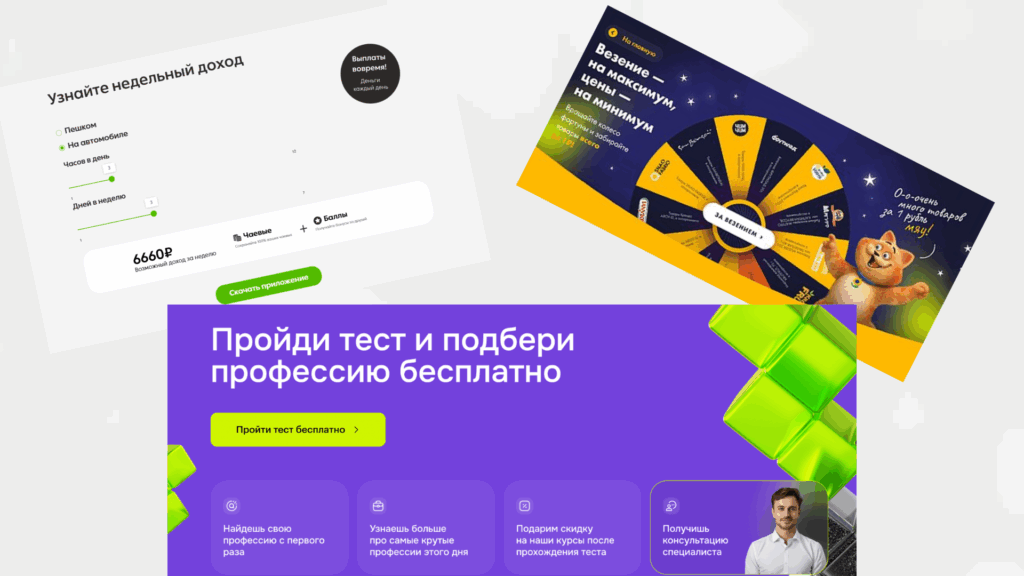 - Минимум текста, максимум вовлечения. Мини-игры вроде колеса фортуны или тесты с прогресс-баром работают лучше длинных описаний.
