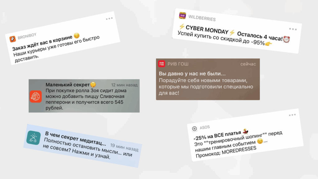 - Персонализация. Используйте релевантный контент, чтобы увеличить вовлеченность. Применять можно через пуши на брошенные корзины, действия на сайте, персональные рекомендации на основе истории просмотров.