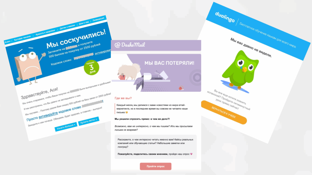 Когда и сколько писем слать: через 30+ дней без активности, 2–3 письма с интервалом 5–7 дней.