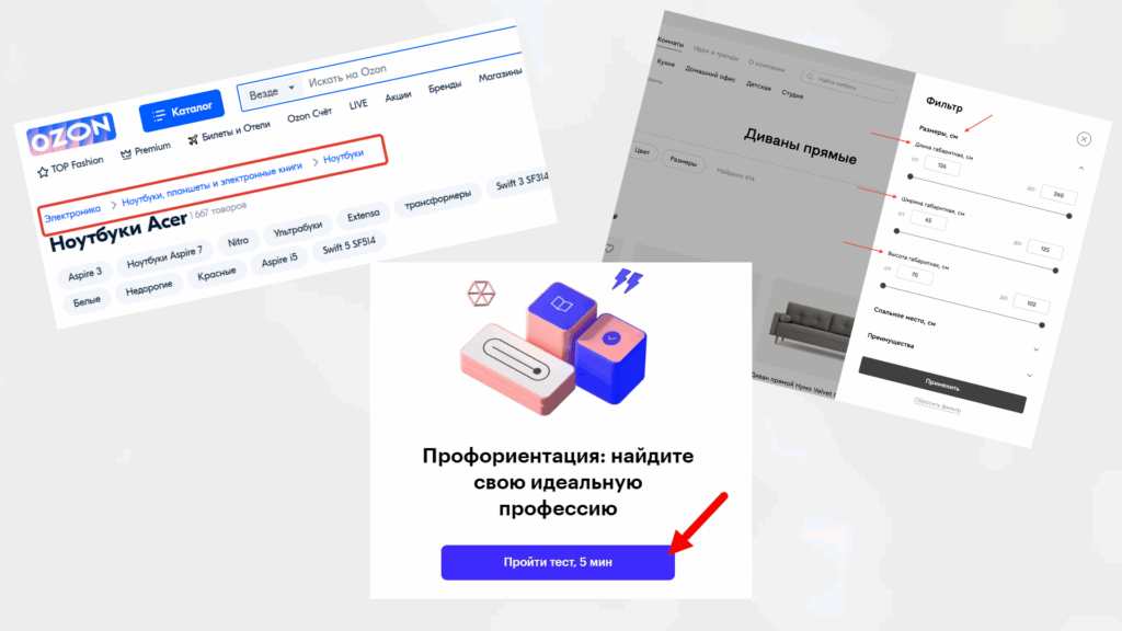- Яркие визуалы и заголовки. Для квизов и опросов — визуальный выбор с иконками, для кейсов — формат «до/после» в картинках.