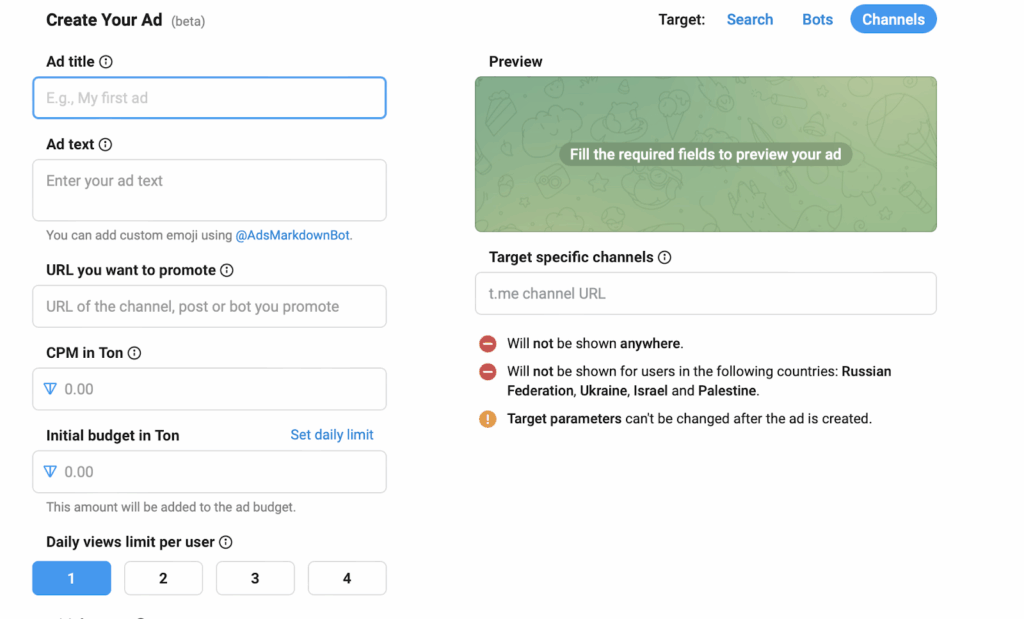 Target users — реклама показывается на любых каналах людям, которые подписаны на каналы, добавленные в наш пул.