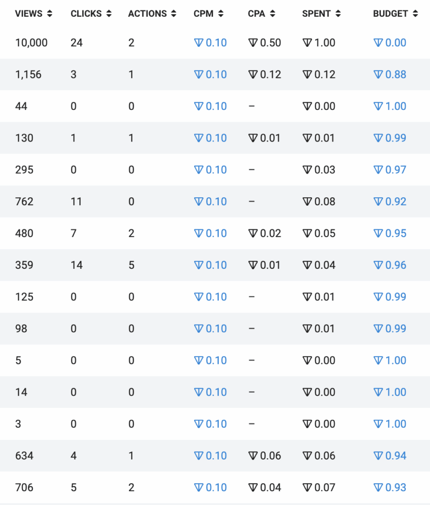 Тон-кабинет может показаться привлекательным: минимальный бюджет для запуска — 20 Ton и нет оплаты процентов реселлерам. Но я крайне не советую туда лезть — трафика вы там не найдете. Будет исключительно слив бюджета и следующая картина: