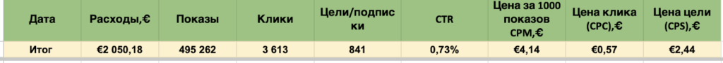 Средняя стоимость качественного подписчика в нашей сфере будет варьироваться и зависеть от того, что мы продвигаем. Партнерки и сервисы будут дороже, блоги — дешевле. Средняя стоимость за подписчика — 3–4 евро. Средний дневной бюджет у вас будет в районе 30–50 евро.