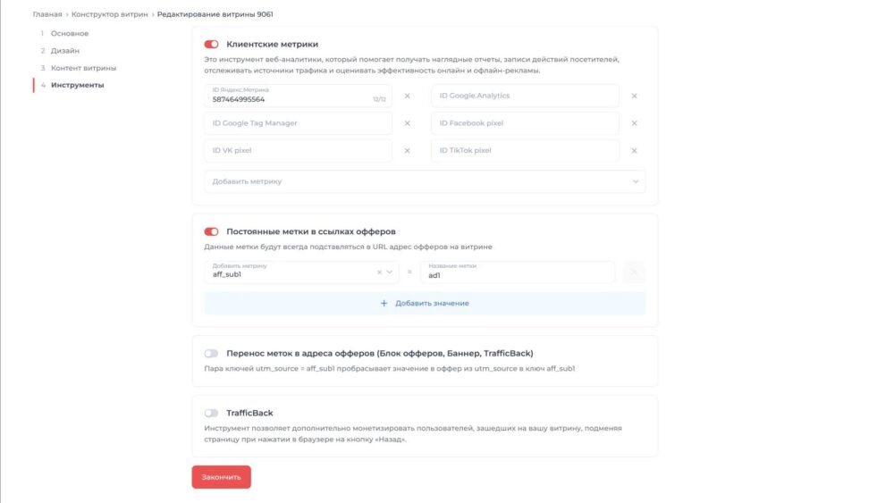 - Глубокая аналитика: Вставка любого стороннего кода (JS, HTML, CSS) в разделы head и body. Поддержка Яндекс.Метрики, Google Analytics, Google Tag Manager, а также пикселя VK. API-интеграция: Полноценное API для управления офферами и ссылками, что открывает возможности для сложной автоматизации.