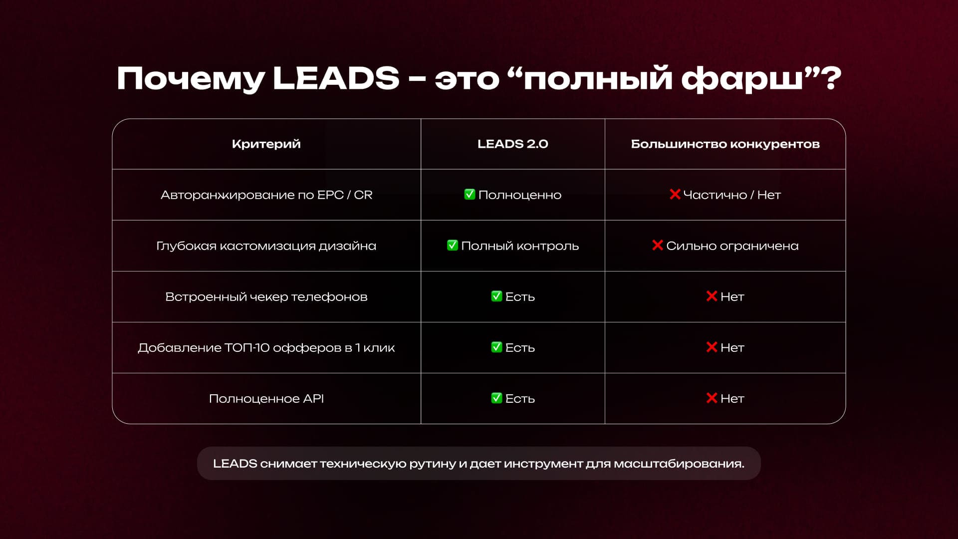 Как видите, в мире арбитража трафика важно иметь не просто инструмент, а по-настоящему надежное и стабильное решение. Именно такое решение предлагает LEADS.