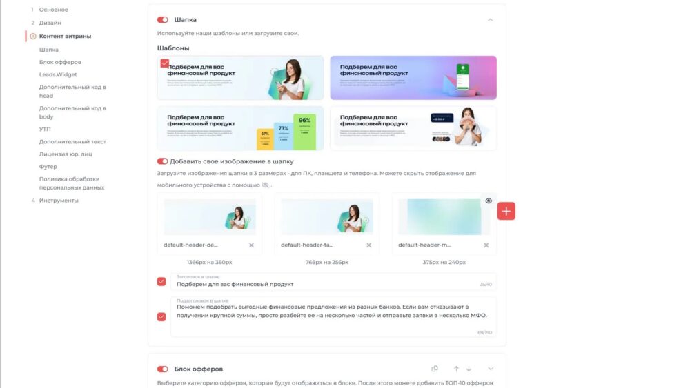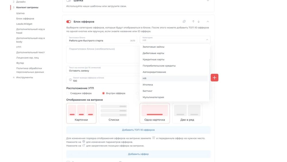 - Редактирование контента: Полная свобода в редактировании всех текстов на витрине, включая описания офферов, заголовки и УТП-блоки. Вы можете менять текст в карточках офферов и расставлять акценты.