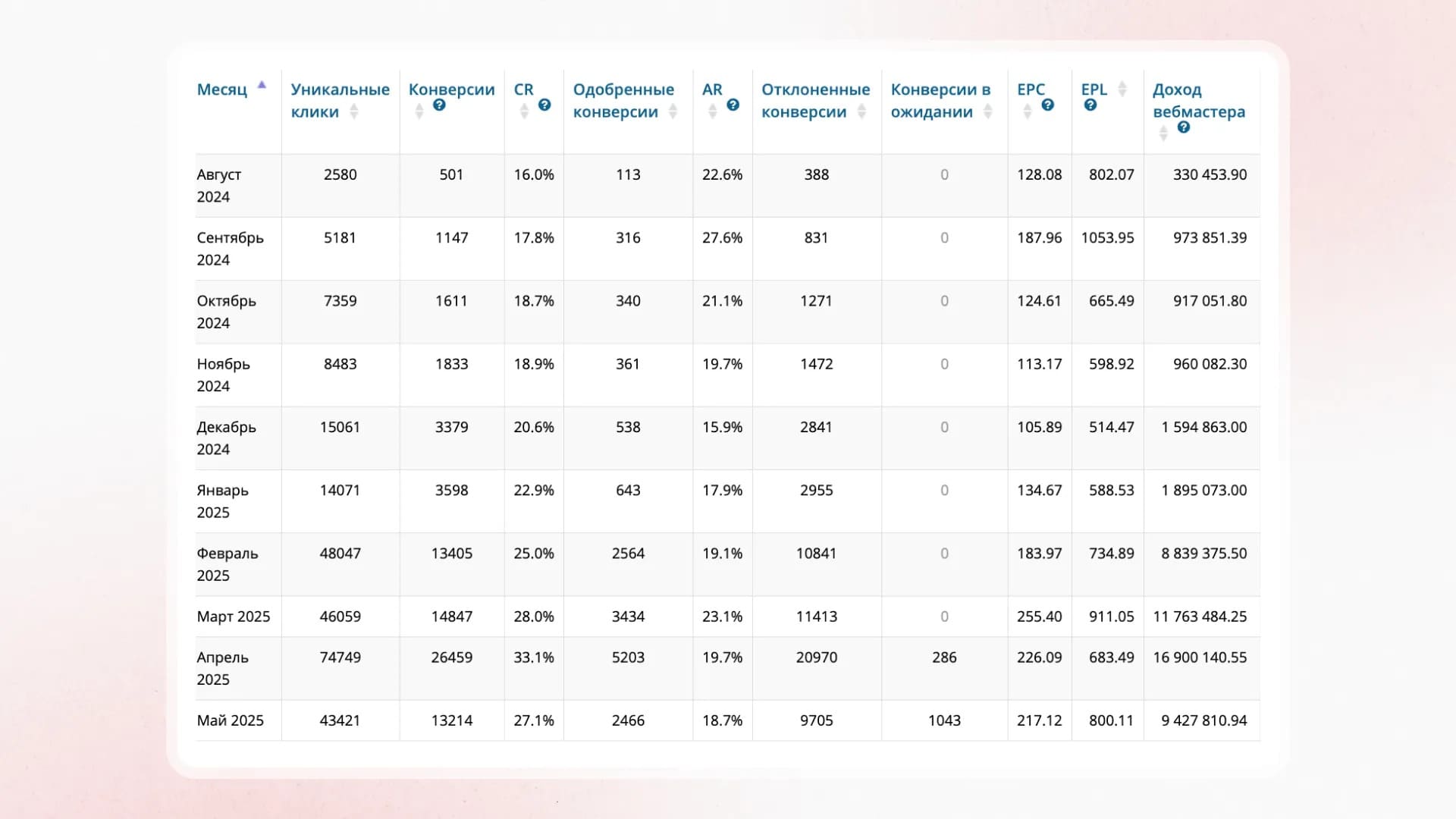 За счет чего: Все данные по кликам, конверсиям и доходам агрегировались прямо в интерфейсе конструктора и партнерского кабинета.