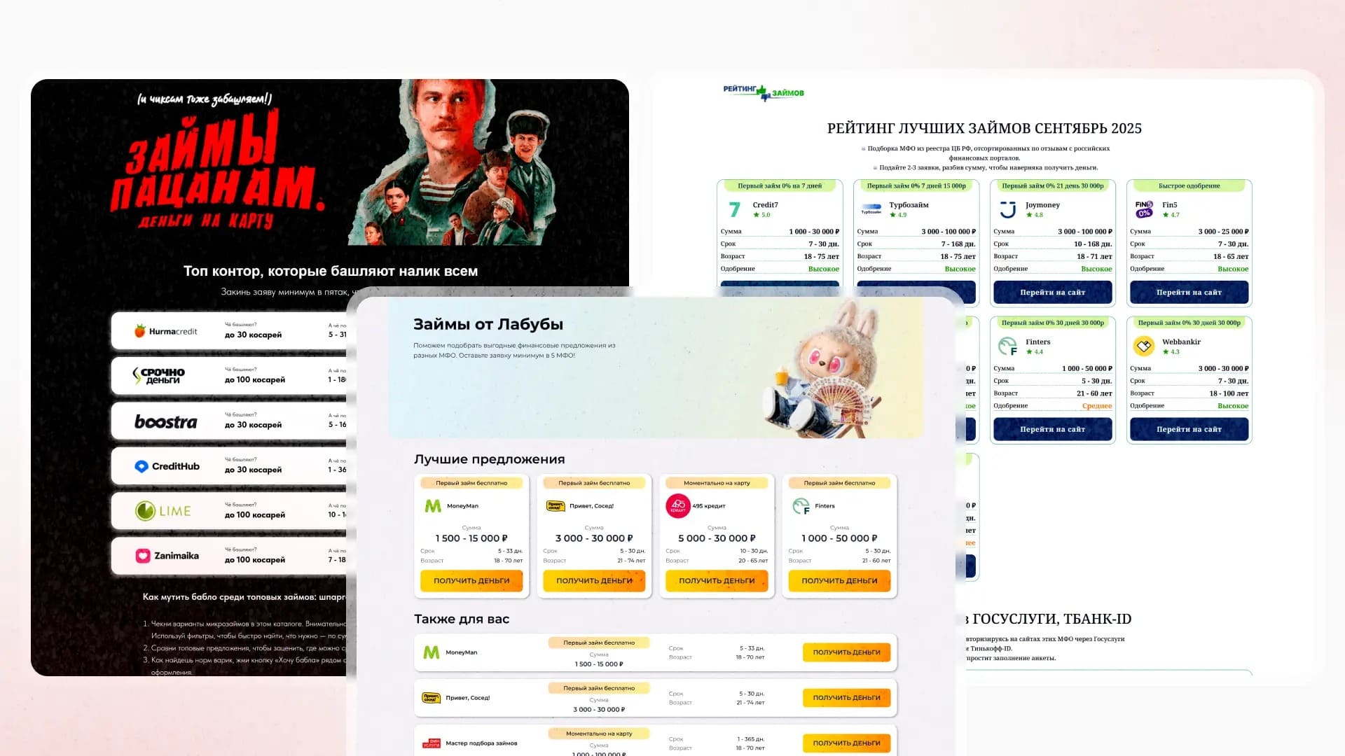 - Финансы: Микрозаймы, кредитные карты, кредиты наличными, дебетовые карты, рефинансирование.