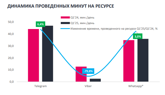 В 2024 году показатели снижались не сильно, но в конце 2024 года и начале 2025 года произошел резкий скачок вниз. Конечно, это связано с тем, что с декабря 2024 года РКН ограничил доступ к Viber. В 2025 году среднее время, проведенное на платформе, составляет всего 3 минуты.