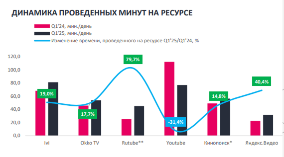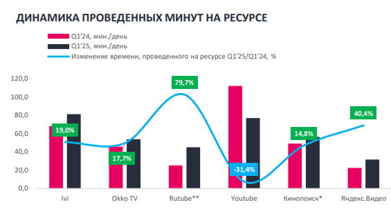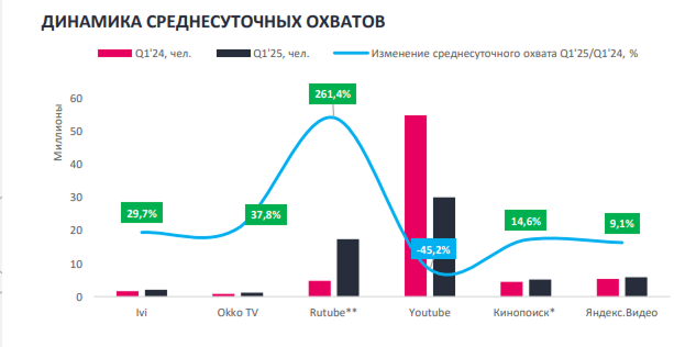 Взрывной рост замечен у Rutube. В 2025 году аудитория Rutube составляет 77 миллионов человек. Среднесуточный охват в первом квартале 2025 года увеличился на 261,4%.
