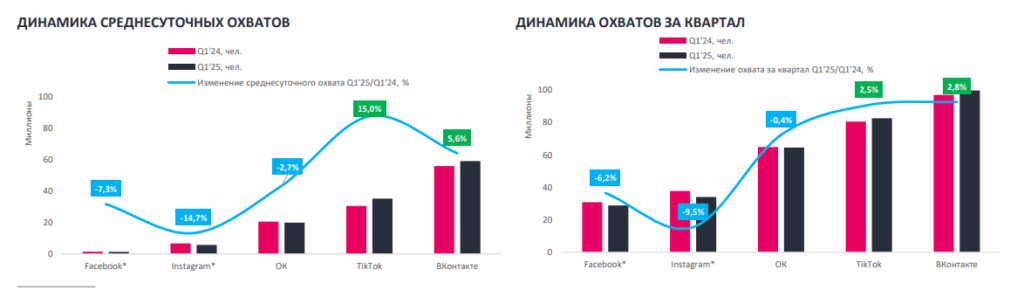 У Instagram показатели проведенного времени и охватов в 2025 году увеличились, если сравнивать их с концом 2024 года. Если сравнивать с первым кварталом 2024 года, охваты, наоборот, снизились.