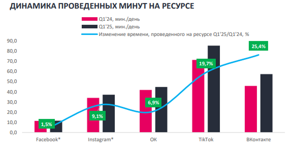 У ВКонтакте немного выросли охваты и заметно увеличилось количество времени, которое пользователи проводят на площадке. В первом квартале 2025 года люди проводят в соцсети примерно 57 минут. Темпы роста последнего показателя даже больше, чем у самого популярного мессенджера — Telegram.