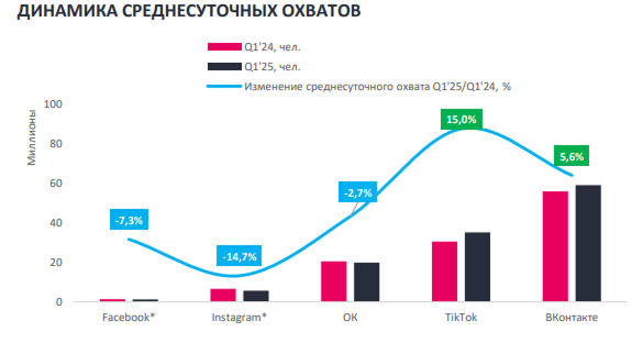 На популярности Facebook сказались запреты на использование зарубежных соцсетей. Охваты постепенно снижаются, хотя количество проведенного времени в Facebook в 2025 году увеличилось, сейчас это около 10 минут в день.