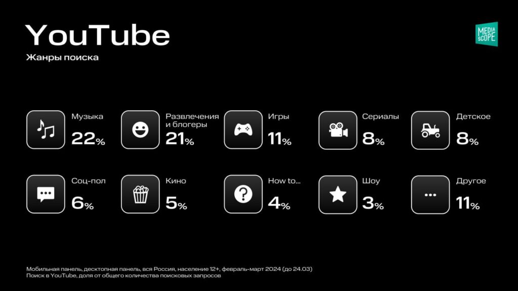 Самые популярные жанры поиска на Youtube: музыкальные клипы и подборки, развлекательный, блогерский, геймерский контент.