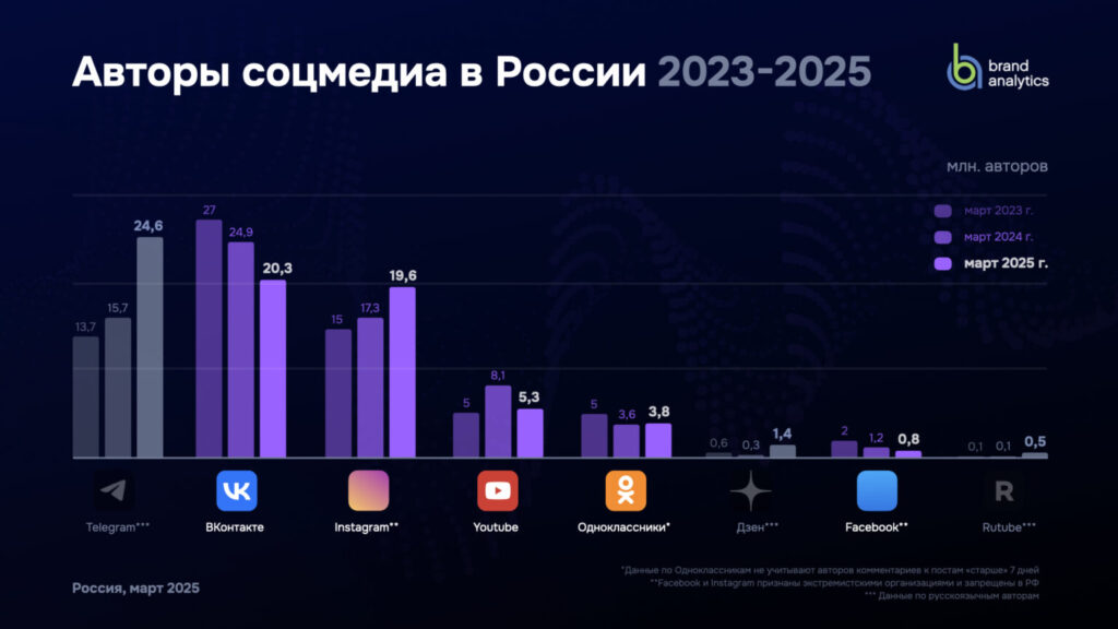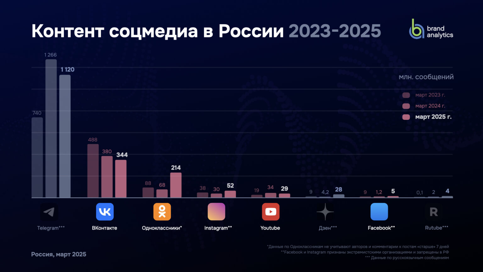 Хотя Instagram заблокирован, среди соцсетей он занимает второе место по авторам, третье — по количеству контента. Такие данные приводит Brand Analytics ↓