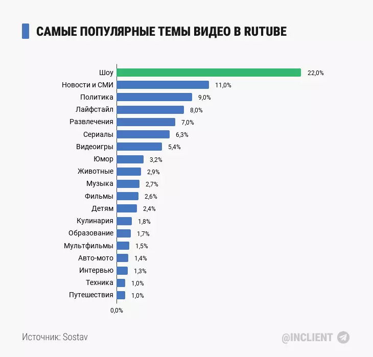 По данным Inclient, 51% пользователей посещают платформу с десктопный устройств, 49% — с мобильных. Самый популярный контент у пользователей: шоу, новости, политика и лайфстайл.