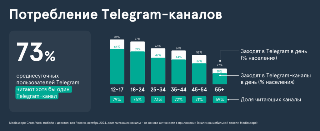По данным PPC World, каждый день пользователи проводят в Telegram примерно 47 минут, на 3 минуты больше, чем в 2024 году. В Mediascope подсчитали, что чаще всего заходят в телеграм-каналы и изучают их зумеры — 12–17 лет. На втором месте категория 18–24 года, на третьем — 25–34 года.