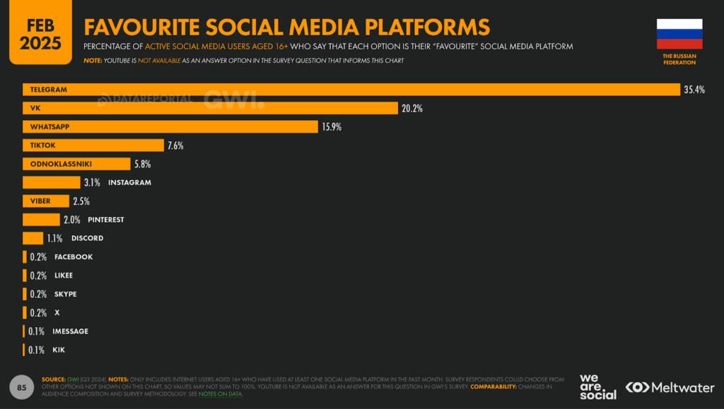 We Are Social, Meltwater и DataReportal, определили самые популярные платформы в России. Ожидаемо, первое место занял Telegram, на втором — ВК, на третьем WhatsApp. Viber — на 7 месте, что неудивительно после блокировок. Но пока Viber все еще популярнее, чем Pinterest, X или Facebook.