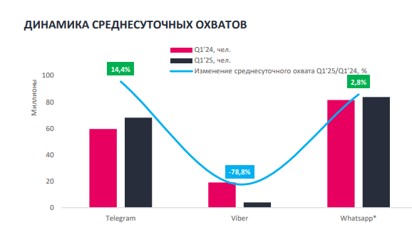 В 2024 году показатели снижались не сильно, но в конце 2024 года и начале 2025 года произошел резкий скачок вниз. Конечно, это связано с тем, что с декабря 2024 года РКН ограничил доступ к Viber. В 2025 году среднее время, проведенное на платформе, составляет всего 3 минуты.