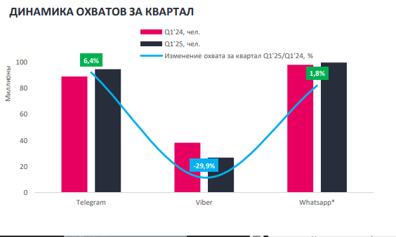 Аналитики E-Promo сравнили охваты и время, которое пользователи проводили в мессенджере, в первом квартале 2025 года относительно первого квартала 2024 года, а затем эти же показатели в четвертом квартале 2024 и первом квартале 2025 года. У Telegram все цифры стабильно растут.
