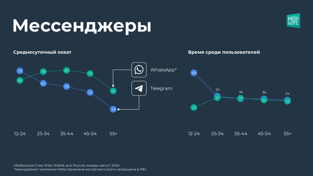 Больше всего времени в мессенджере проводят пользователи в возрасте 25–44 года и 45–54 лет.
