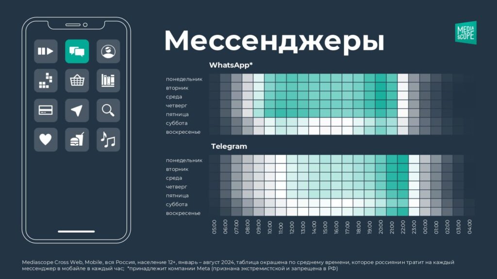 Самое активное время использования мессенджера — будние дни в 20:00.