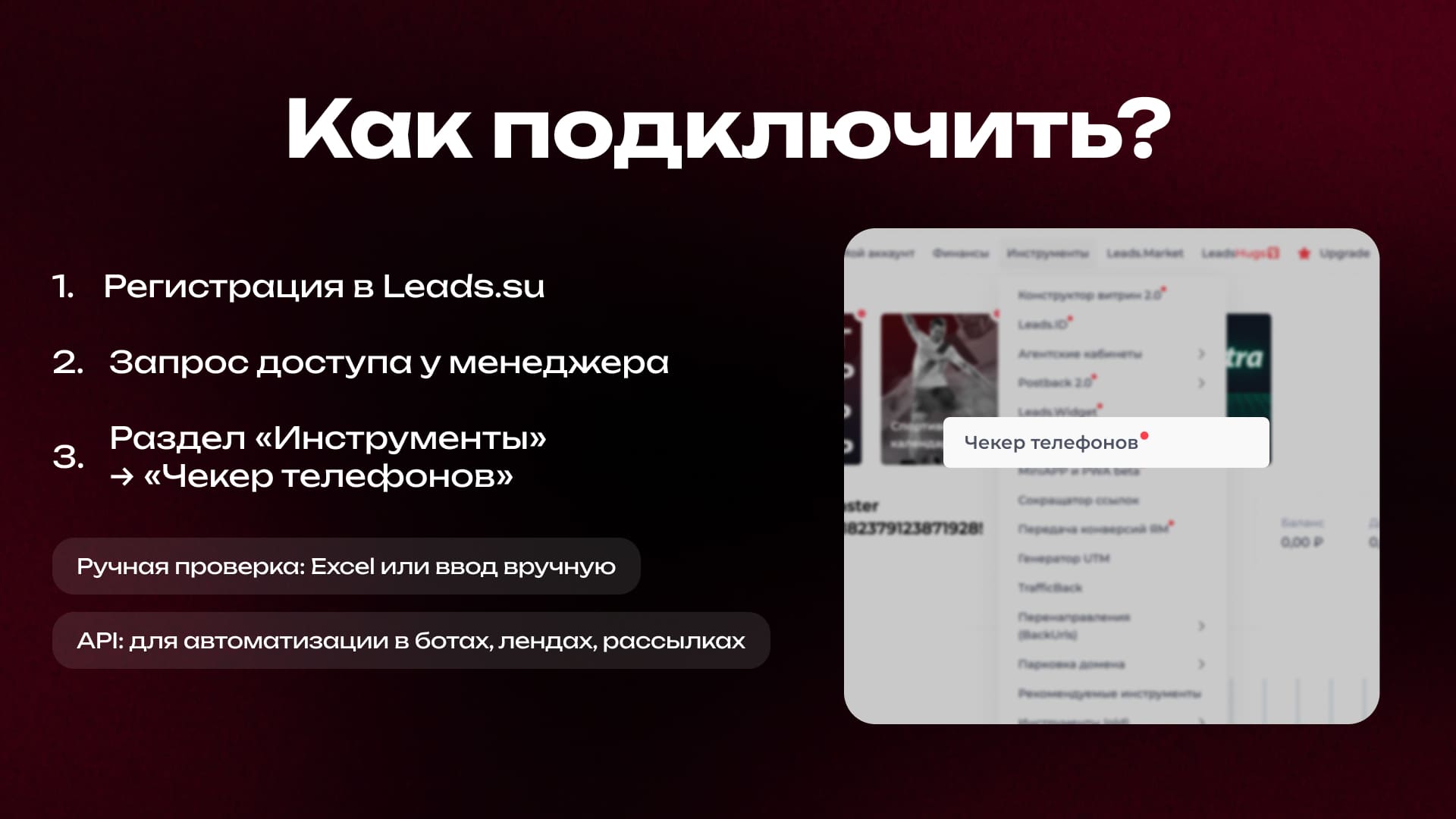 - Запросить доступ у личного менеджера. После подтверждения инструмент появится в разделе «Инструменты» → «Чекер телефонов».