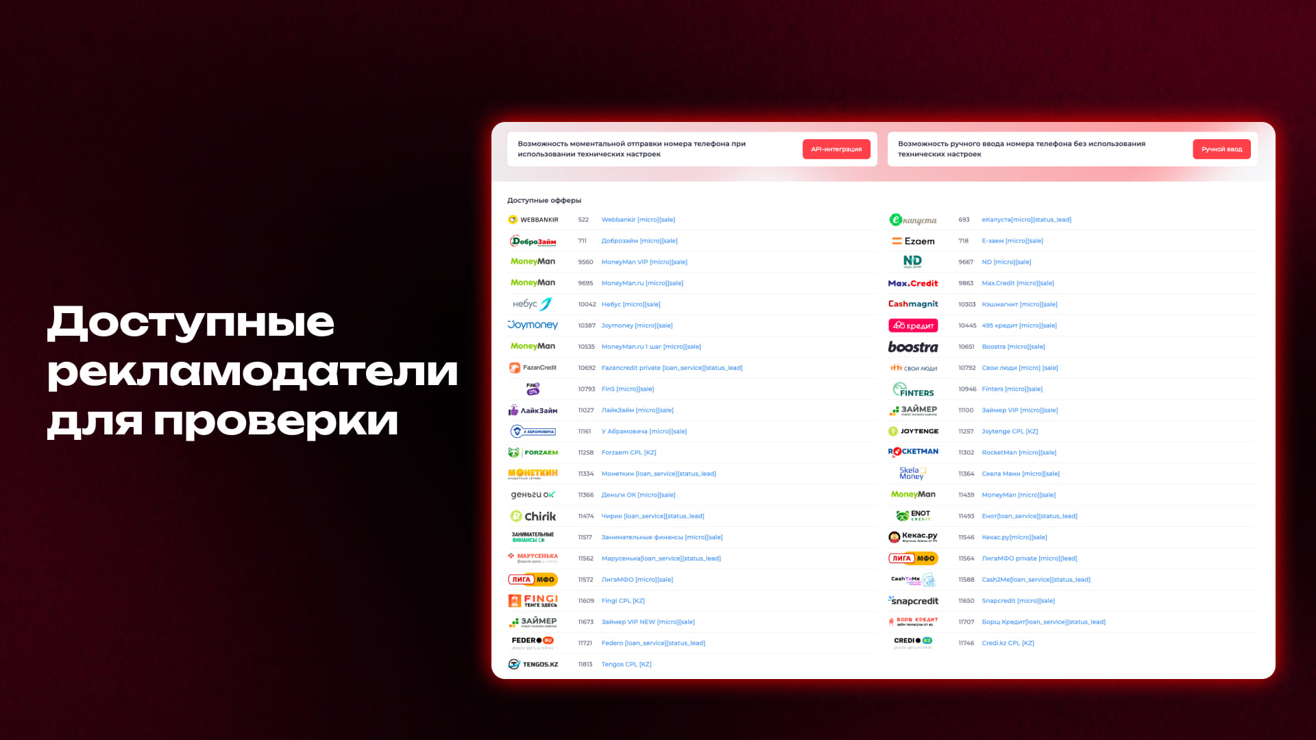 Доступны партнерские программы МФО, где рекламодатель дает данные.