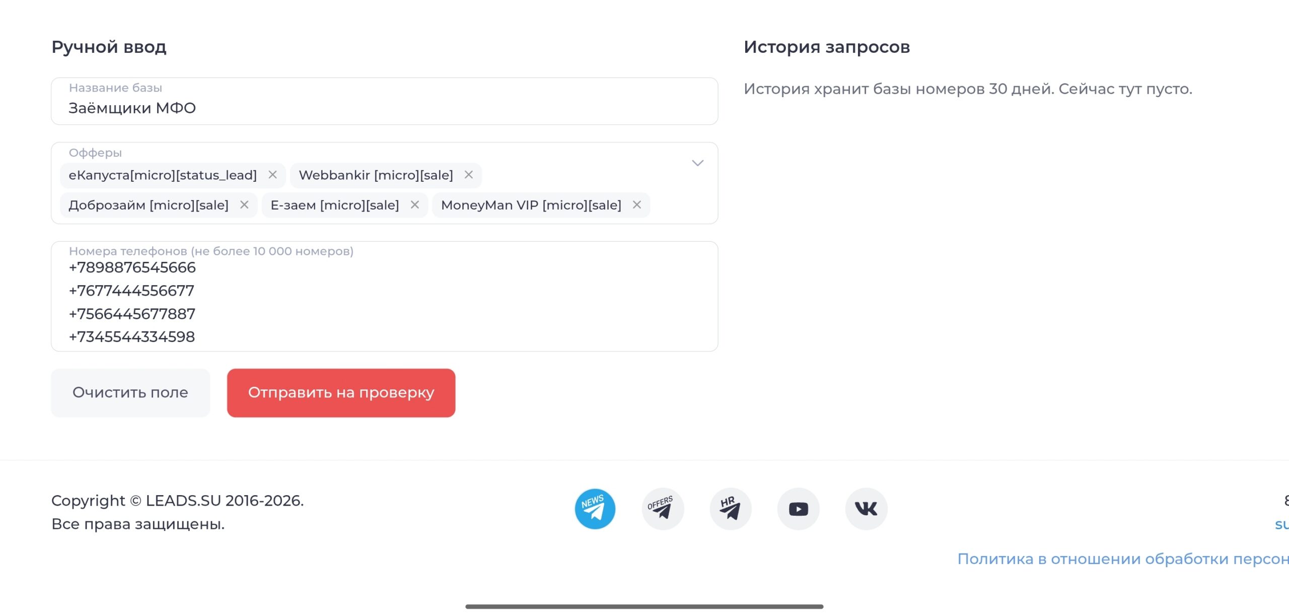 Первое — задаёшь название базы. Второе — выбираешь нужные офферы из списка. Третье — вставляешь номер в поле и нажимаешь «Отправить на проверку». Проверка уйдёт в работу, а готовый результат появится в истории запросов. Оттуда его можно открыть и скачать.