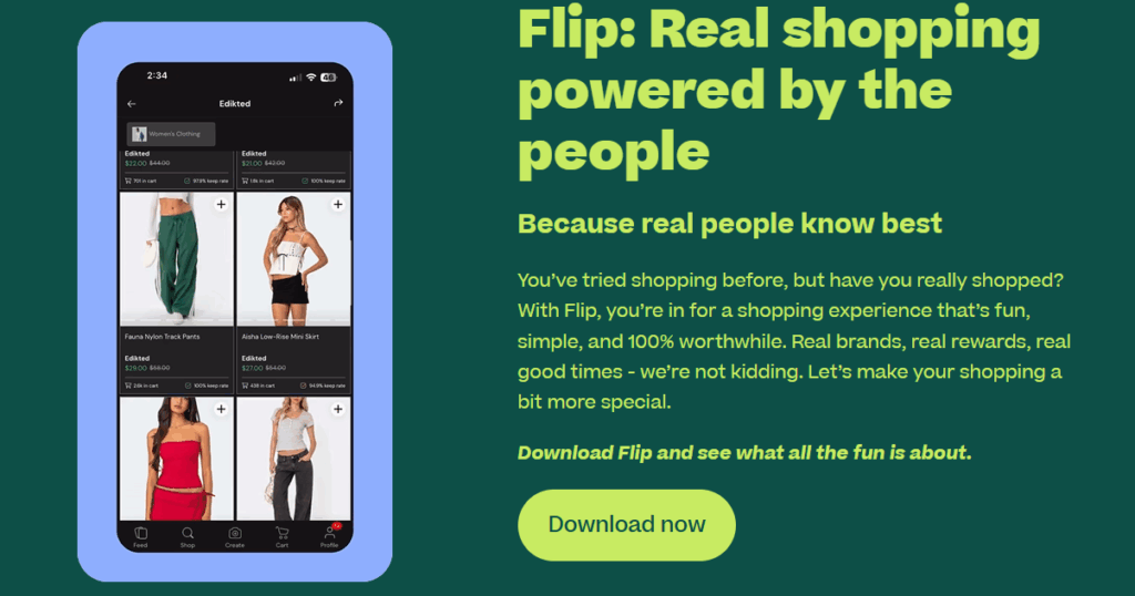 Flip — это социальная сеть в формате видеошопинга, где опять-таки решает нативка. Что-то вроде TikTok, только здесь каждое видео что-то продает. Тут обитает в основном поколение Z и миллениалы из США и Европы, уставшие от навязчивой рекламы, но все еще готовые покупать по рекомендациям.
