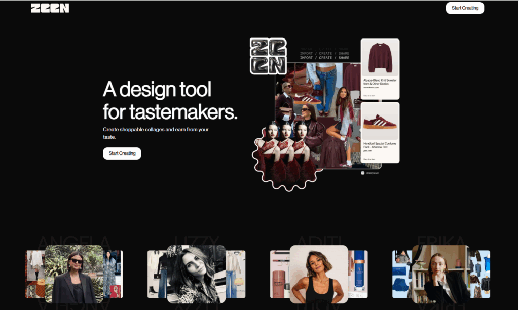 Zeen — это соцсеть, где пользователи создают красивые коллажи из товаров, добавляют к ним партнерские ссылки и делятся с другими. По сути, это визуальная витрина, которая превращает каждый пост в интерактивный шопинг.