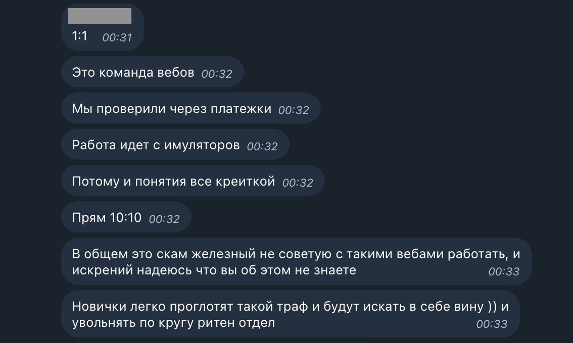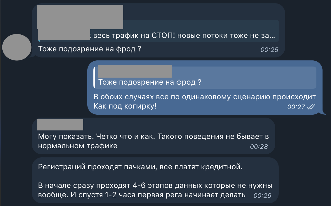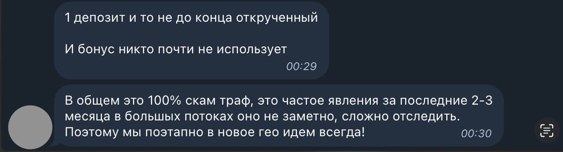 Окончательно все подтвердилось на техническом уровне — через платежные системы. Стало очевидно, что продолжение работы с этим трафиком несет прямые риски: финансовые потери, искаженная аналитика и ошибочные управленческие решения. Именно поэтому было принято жесткое, но единственно правильное решение — полностью остановить трафик и закрыть вопрос. Финансовые и репутационные потери в этом случае понес только скамер — справедливость восторжествовала.