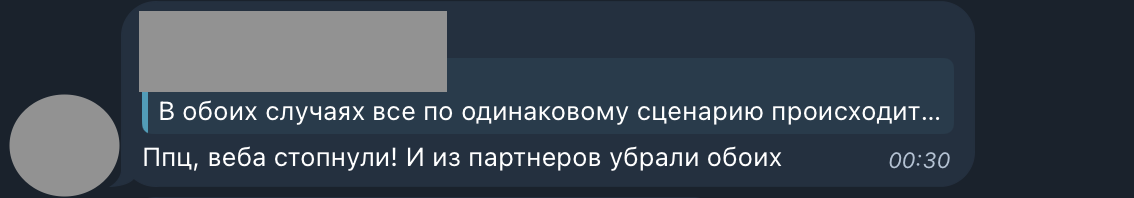 В чате это сформулировали предельно прямо: «Ппц, веба стопнули! И из партнеров убрали».
