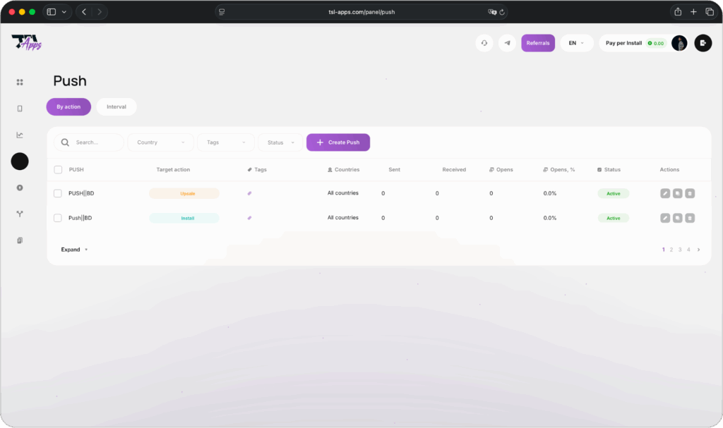 Она включает в себя 4 пуша по действию — инсталл, рега, деп и редеп — и 3 ежедневных интервальных пуша с адаптацией под язык гео. Команды и соло-вебы, которые только начинают работать с нашим сервисом, относятся к фиче со скепсисом. Но после первого же теста понимают, что реализованная механика даёт сильный буст статистики.