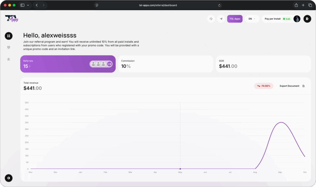 На странице рефералов — максимально подробная статистика для прозрачного сотрудничества.