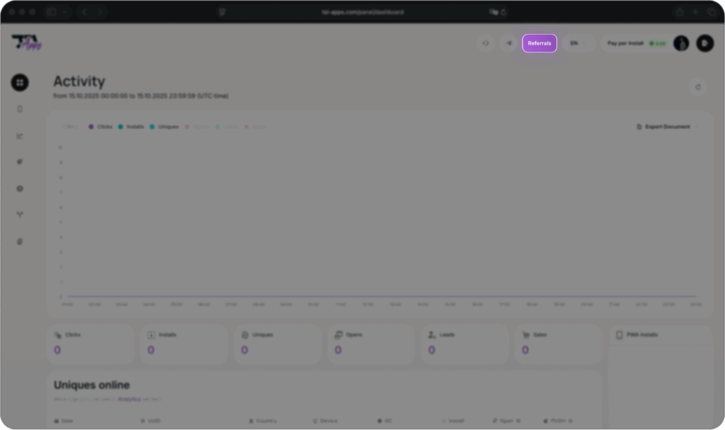 Личный кабинет доступен автоматически после регистрации в сервисе. Для перехода нужно нажать на кнопку «Referrals» в верхнем меню навигации основного ЛК.