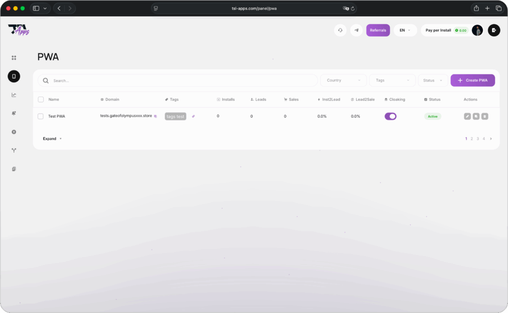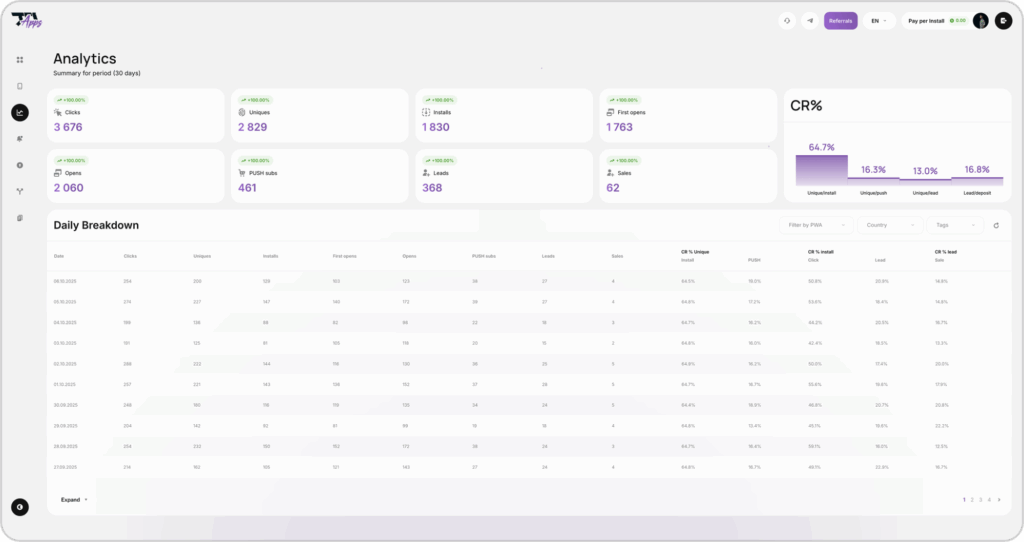В личном кабинете во вкладке «PWA» можно увидеть список приложений и аналитику за всё время.