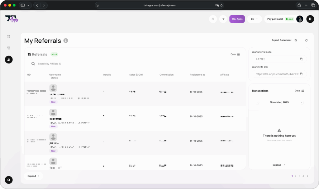 В боковом меню справа всегда доступна ссылка для приглашения новых рефералов, а также информация по транзакциям за нужный период.